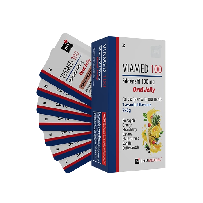 VIAMED 100 by Deus Medical is a fast-acting oral jelly form of Sildenafil Citrate 100mg — the active ingredient in Viagra. Each box contains 7 flavoured 5g sachets that dissolve quickly in the mouth, offering a convenient and discreet alternative to standard tablets.